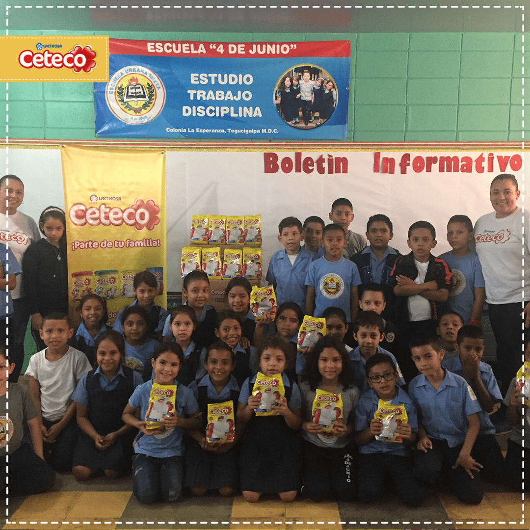 El pasado viernes 28 de febrero se realizó la cuarta entrega de 720 litros de Leche Ceteco a la Escuela 04 de Junio, ubicada en la colonia la Esperanza de Tegucigalpa. Durante la entrega, un grupo de colaboradores disfrutaron de actividades con los niños quienes también degustaron la Leche Ceteco que se les preparó.